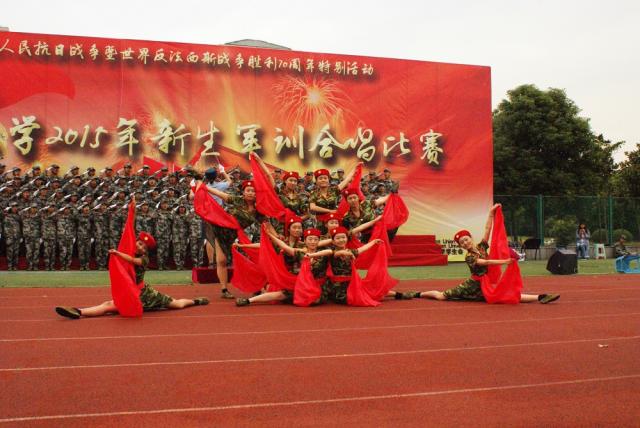 为纪念中国抗日战争暨世界反法西斯战争胜利70周年,深化同学们的爱国意识和国防意识。2015年9月15日下午,我校在梅园体育场隆重举行新生军训合唱比赛。九个连队的合唱队同台竞技,共同歌颂抗战的伟大胜利。