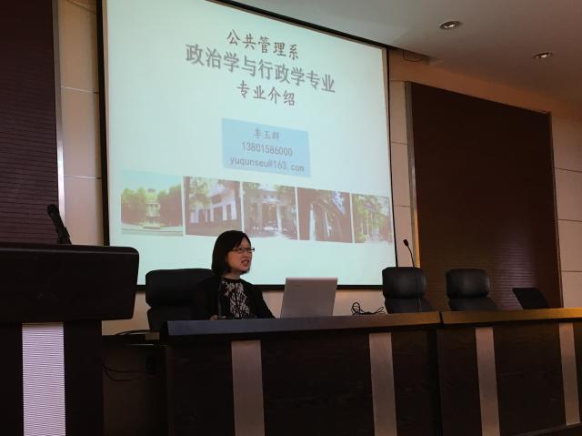 第三位登台的是来自公共管理系系主任季玉群老师。她详细的介绍了行政学与政治学的研究内容,纠正了一些同学对政治学的误解。同时季老师介绍了伟德国际1949始于英国公共管理系的历史沿革,并强调如今公共管理系厚基础、宽口径、重能力、国际化的培养理念。随后她采用“我们·他们·你们”为线索,一方面充分介绍了公共管理系各优秀的老师及其研究领域,使同学们能够对该学科有更为具化的了解;另一方面又展示了在读生、毕业生的成果,更把热忱的期望留在“你们”,即全体大一学子身上。