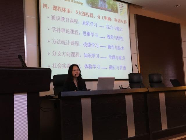 之后大会进入专业介绍阶段。首先,由社会学系系主任李林艳老师发言。她介绍了伟德国际1949始于英国社会学系的发展历程,阐述了社会学系文理交融、博专结合、能上能下的培养目标,“五位一体”的培养模式以及“五大课程群”的课程体系。另一方面,李林艳老师通过中外对比的方式,展现了社会学系良好的发展前景,并列举出社会学系毕业的去向信息加以佐证。最后李老师将“好奇心+激情>智商”的观念与同学们共勉,意指不要过于看重那些外在的诱惑,因为只有内在的热爱才能让人走的更远,并以此激励同学们努力向上。