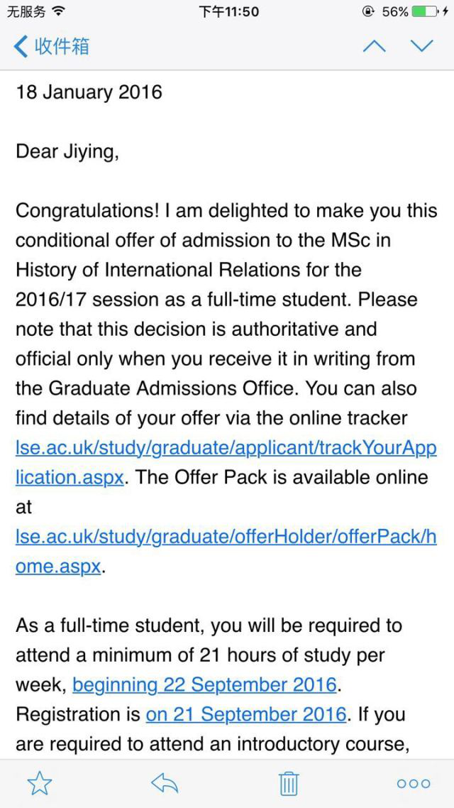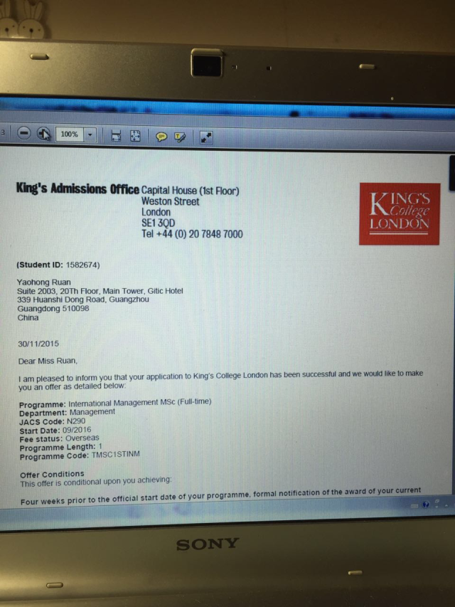 阮垚澒,雅思7分,收到伦敦国王学院、巴斯大学、杜伦大学、爱丁堡大学、华威大学、曼彻斯特大学等众多名校录取通知,最终确定伦敦国王学院。