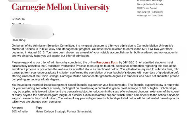 戴嵚崎,绩点4.134/4.5,托福104分,GRE 327+3.5,获得中美富布赖特公费项目硕士生全额奖学金。收到卡耐基·梅隆大学、约翰·霍普金斯大学、纽约大学等众多名校的录取通知,最终确定卡耐基梅隆大学。