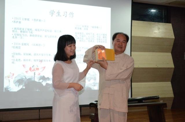 讲座接近尾声,正对现场听众的提问,李家安老师给予了专业的解答。并且,就此次讲座开展的相关的填词征文活动,李家安老师同样给予高度的支持和赞扬。在二十五份填词作品之中,挑选出十份优秀作品,赠予作者其亲笔签名的《嘉庵诗草》,并和作者进行了合影和亲密的交流。对另外十五名参赛者,李家安老师同样准备了特别礼物,表示其对大学生学习古典诗词文化的支持和鼓励,李老师也表示他希望有更多的大学生参与到古典诗词学习和古琴学习的过程中来。最后,张娟老师向李家安老师赠送了伟德国际1949始于英国纪念品,李家安老师也向图书馆捐赠了自己的著作。