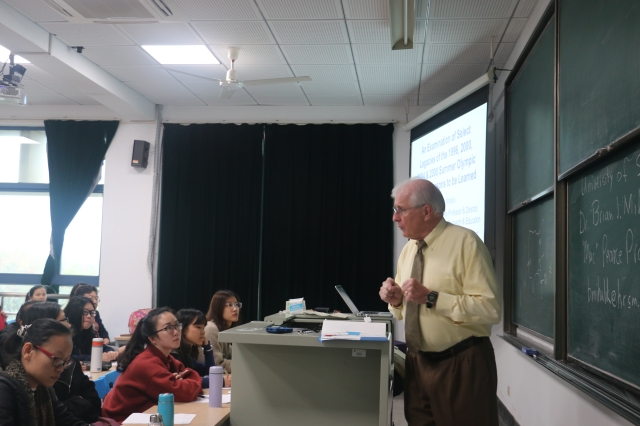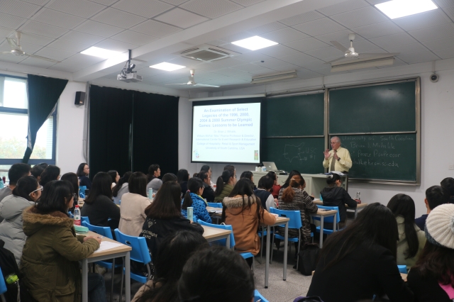 演讲中,Mihalik教授首先向同学们列出了自1976年蒙特利尔奥运会至2012年伦敦奥运会的承办费用来进入讲座的主题—奥运与城市发展:看历届奥运遗产现状及其城市。教授阐述了世界各国争夺奥运会举办权的重要缘由,即能够在国际上树立强大的国家形象,同时指出高额的场馆建设和后期维护费用应当引起主办城市的重视。以1996年亚特兰大奥运会的场馆后期改建为例,教授向同学们展示了建设适用性、临时性奥运场馆的社会意义和经济意义。通过对亚特兰大、巴塞罗那、雅典和北京奥运会奥运遗产的梳理,同学们对奥运会的举办有了更加系统和全面的认识。最后,Mihalik教授就有关今后奥运会举办权的管理,提出了独特见解。
