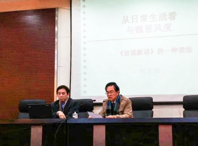 报告开始,中文系王华宝教授为大家介绍了程章灿教授及讲座主题。程教授北大学史(世界历史)、南大从文(古代文学),文史兼修,沟通中外,治学涉及赋学、六朝唐宋文学、石刻文献、江苏地方文化和国际汉学等众多研究领域。所讲“从日常生活看魏晋风度”,又是一个很有吸引力的话题和研究课题。因为每一个人,都希望生活美好,期待在大地上诗意地栖息。而程老师既是学问家,发表众多学术论著,又是文学家,有大量的诗文创作,还是南京文化研究专家,由他谈如何读《世说新语》、领略魏晋风度,别有情趣。