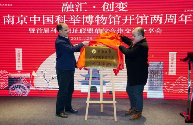 1月28日是南京中国科举博物馆开馆两周年纪念日,该馆于是日举行了盛大的“融汇·创变----南京中国科举博物馆开馆两周年暨首届科举遗址联盟单位合作交流分享会”,在与会的省市区各级领导、各位专家学者、省内外文博系统代表、科举联盟成员单位代表及各位嘉宾的共同见证下,伟德国际1949始于英国党委书记李涛和南京中国科举博物馆副馆长尹磊共同为“伟德国际1949始于英国旅游学系实习基地”揭牌,开启了馆校合作新篇章。