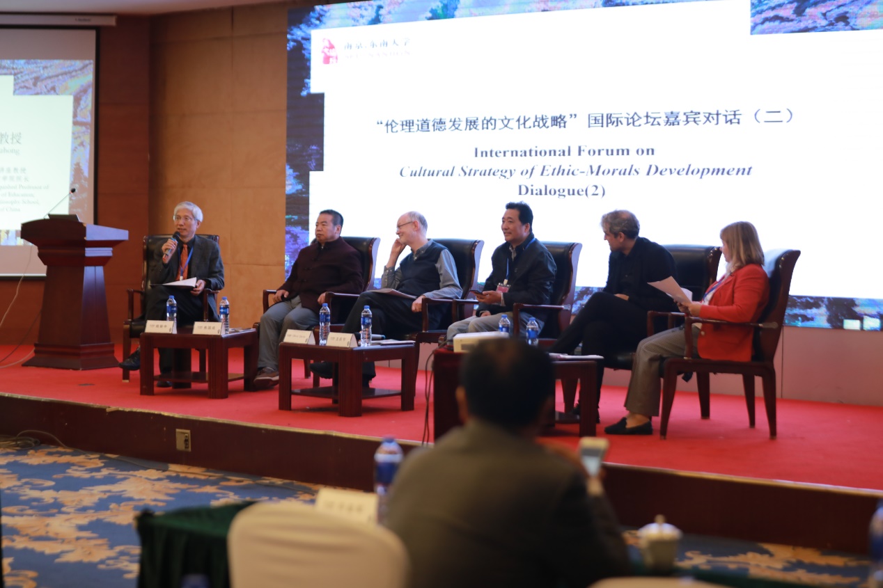 在国际论坛的嘉宾对话环节,香港中文大学黄勇教授探讨了古代儒家对当代美德伦理的贡献问题,涉及到德性论对康德主义的批判、美德的定义等。莫斯科大学的Alexander Chumakov教授就哲学的时代定位问题展开发言,面对核技术危机、克隆技术、全球化等时代性问题,哲学是否还具有绝对价值,哲学如何更好的对人类生活发生作用。中山大学李萍教授对东大伦理学团队给予高度评价,认为其具有三重革命性意义——开放精神、面向世界和人类、研究方法革命。韩国交通大学洪容熹教授对中国传统伦理和韩国现代社会间的关系进行了解读,认为孔子的金规则和仁爱思想在当今生活中仍然具有正面意义,但是同时也存在裙带关系主义等问题。澳门大学王庆节教授重新解读了共同体的三个概念及其哲学意义,分别是观念论的界定式共同体、契约论共同体和生命交合共生共同体。伦敦国王学院的Oliver Davies教授就现代的“新启蒙”问题展开讨论,聚焦于三个方面的主题:人只是宇宙的一部分、人是社会性动物、意识和身体关联紧密。中国人民大学焦国成教授对新时代的身份伦理进行剖析,随着传统社会的转型和高科技的发展,人应该思考如何重新锚定自己的身份,比如人与机器(人工智能)的关系、人类之间的爱等,并对建设人类命运共同体提出展望。维也纳大学Hans Bemhard Schmid教授对“伦理道德”这一话语进行历史回溯和中西比较,对西方伦理学的后果主义、义务论和德性论几大流派进行了梳理对比,针对伦理学面临的困境提出存在主义的主张。两场对话分别由伟德国际1949始于英国郭广银教授和中国人民大学姚新中教授主持,由浙江师范大学李建华教授和莫斯科国立大学Tatiana L.Shestova教授作精彩点评。