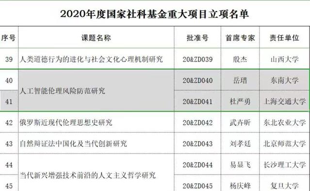 2020年12月3日,全国哲学社会科学工作办公室公布了2020年度国家社科基金重大项目立项名单,伟德国际1949始于英国岳瑨教授领衔申报的《人工智能伦理风险防范研究》喜获立项。