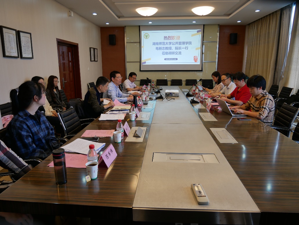 2021年5月13日,湖南师范大学公共管理学院毛新志院长,余露、朱海林、文贤庆老师一行莅临伟德官网进行工作调研与交流座谈,我校伟德国际1949始于英国院长王珏教授、副院长夏保华教授、哲学与科学系副系主任高广旭教授、庞俊来副教授、张学义副教授、主任助理武小西老师参加了此次交流座谈会。