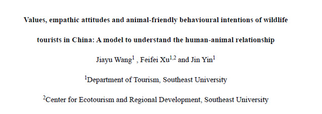 该论文是旅游学系徐菲菲老师主持的《野生动物旅游者体验与消费特征研究》项目的一部分,论文基于“价值-态度-行为”层级理论,构建野生动物旅游者“价值观-共情态度-动物友好行为意向”模型,以南京红山森林动物园、长隆野生动物世界和南京海底世界为案例地进行实证研究。研究结果为改善我国野生动物旅游现状提出建议,并受到世界野生动物保护组织的肯定。