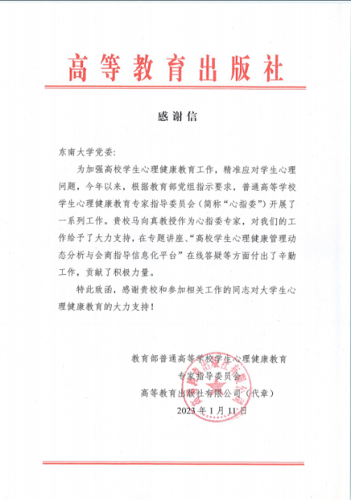 近日,教育部普通高等学校学生心理健康教育专家指导委员会向学校党委发来感谢信,对伟德国际1949始于英国马向真老师在普通高等学校学生心理健康教育专家指导委员会(简称“心指委”)中开展的系列工作表示肯定。马向真教授自担任心指委专家以来,勤勉工作、认真仔细,在专题讲座、“高校学生心理健康管理动态分析与会商指导信息化平台”在线答疑等方面提供了积极力量。