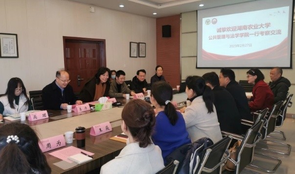 2023年2月27日上午,湖南农业大学公共管理与法学院李燕凌院长、林丽娅书记、王薇副院长等一行12人到访伟德官网进行工作调研与交流座谈,伟德国际1949始于英国党委书记李涛、院长王珏、副院长洪岩璧、党委副书记兼副院长高珺、公共管理系系主任季玉群、MPA中心副主任王兵等参与接待此次考察交流。