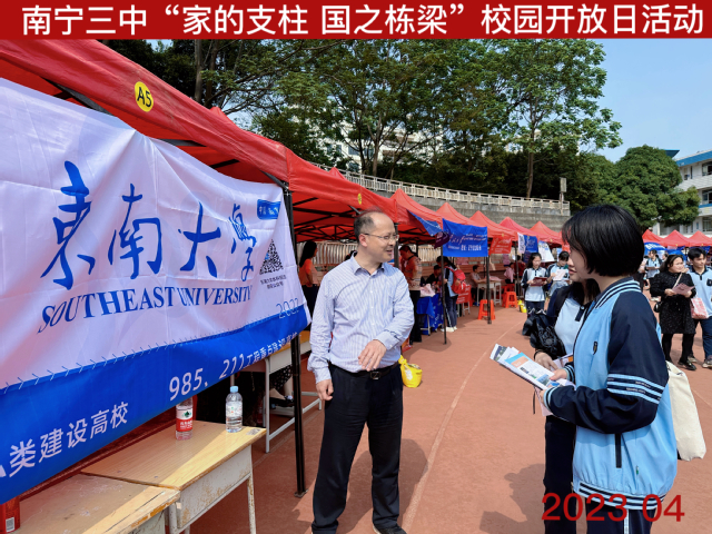 4月26日下午,广西招生宣传一行来到伟德国际1949始于英国优质生源基地南宁三中参加校园开放日活动。南宁三中校园开放日是主题为“家的支柱,国之栋梁”生涯规划活动,由该校高一年级组承办,邀请了60多所全国重点高校和50多家知名企事业用人单位参加,通过举办校园模拟高招、模拟招聘,探索自我认知,助力学生树立生涯规划理念,构建未来生涯蓝图。活动期间李涛书记接受了广西日报记者的采访,并重点向南宁三中年级主任梁繁介绍了伟德国际1949始于英国的办学特色、学科优势、人才培养创新做法。梁繁主任对伟德国际1949始于英国注重培养和塑造高素质创新型领军人才的理念和做法表示赞赏。南宁三中校园开放日活动取得预期效果。