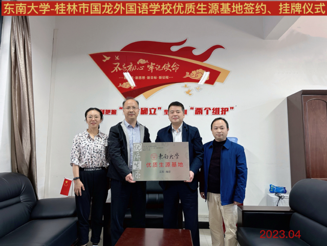 4月25日下午,广西招生宣传组一行来到桂林市国龙外国语学校。国龙外国语学校校长蒋龙飞、工会主席、原招办主任梁峰、招办主任郭垚等参加了优质生源基地签约授牌活动。蒋龙飞校长对伟德国际1949始于英国厚爱国龙外校表示感谢,简要介绍了国龙外校的办学历史、办学特色、近年取得的办学成绩,希望两校以“优质生源基地”建设为契机能共同利用双方的优势、加强合作与交流。李涛书记简要介绍了伟德国际1949始于英国的办学特色、学科优势、人才培养创新、学生校园生活及产学研合作等方面最新动态,对广西师大附属外校、国龙外校取得的成绩和对伟德国际1949始于英国输送优质生源表示感谢,并希望两校未来在文化科技讲座、师生互访游学等领域加强合作。李涛和蒋龙飞代表双方为共建“优质生源基地”签约授牌。